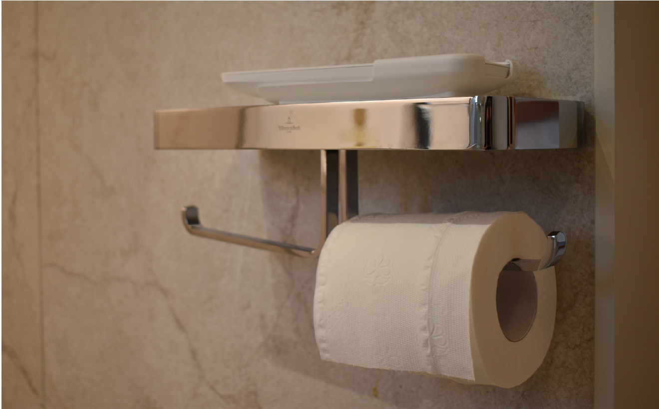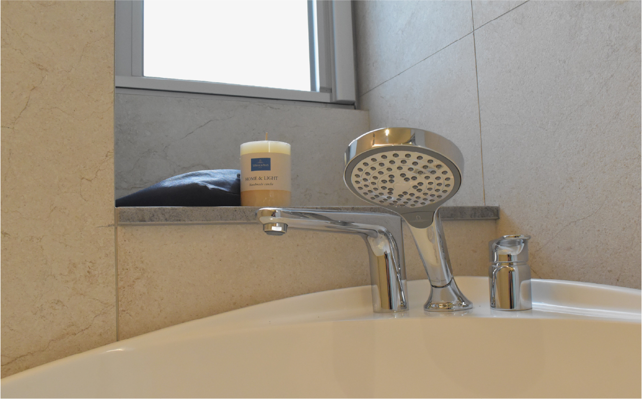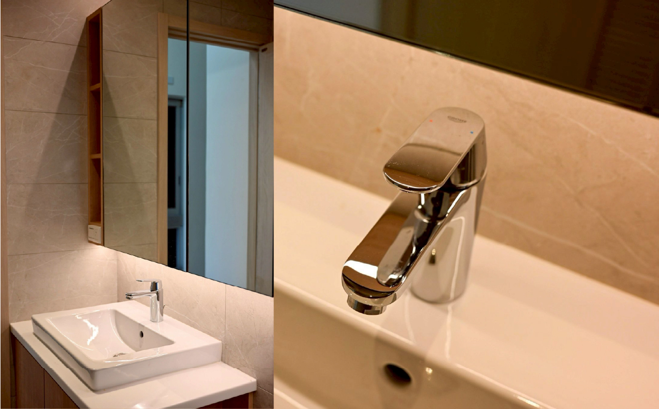 衛浴空間延續這份純粹語境,讓日常也能成為儀式。標準戶型導入 Villeroy & Boch 與 GROHE 的德國工藝,展現俐落而純淨的節奏:Subway 2.0 面盆與 Grohtherm800 定溫浴缸龍頭,將舒適融於日常;Lunea 落地馬桶結合免治設計,讓潔淨悄然成為習慣。而五樓主臥則以專屬格調回應主人品味——Glass Design mini pl01 浴缸勾勒靜謐的私密場景;Avento 面盆以輕盈簡潔呼應空間語彙;Crosswater 電腦馬桶則在科技與優雅之間,轉化出專屬的生活儀式。