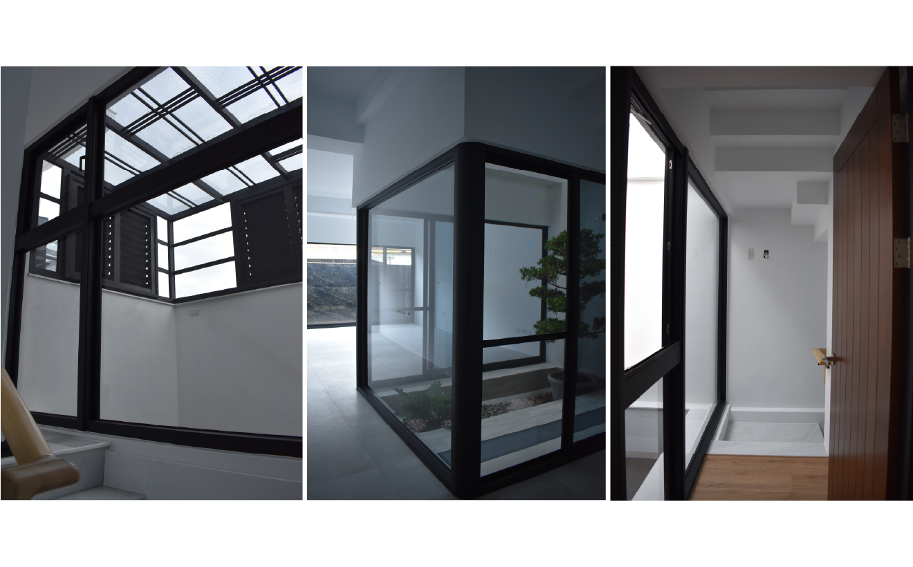 核心設計思維源自微氣候建築哲學,順應光與熱而生。天井作為空間的垂直中軸,導引自然風流動、排散熱氣,形塑舒適且涼爽的室內氣流。光線於白牆間游移,使居者於日夕晨昏之間,得以靜賞墅裡院落的景深,擁有專屬私景與細膩的視覺儀式感。